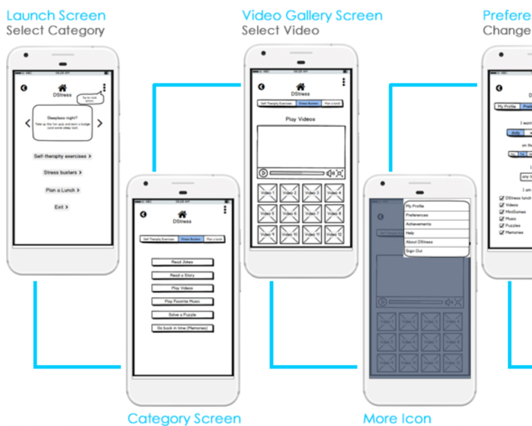 The product concept involved people and their experiences to alleviate stress through qualitative methodologies. My self and other team members conducted research to identify their coping behaviors while under stress. The participants in our research were from different parts of the world and screened to discover opportunities. Other additional techniques during the product conception such as task analysis were used to support the navigation flow.